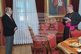 Джаково (27 октомври 2024) В навечерието на Деня на народните будители представители на Националната общност на българите в Хърватия, начело с председателя Рашко Иванов, извънредният и пълномощен посланик на България в Хърватия Ива Крулева, представителят на българското малцинство в Общинския съвет на град Загреб Перо Дианков и българи, живеещи в Хърватия, посетиха град Джаково. На снимката: Митрополит Джуро Хранич и Рашко Иванов (вляво).