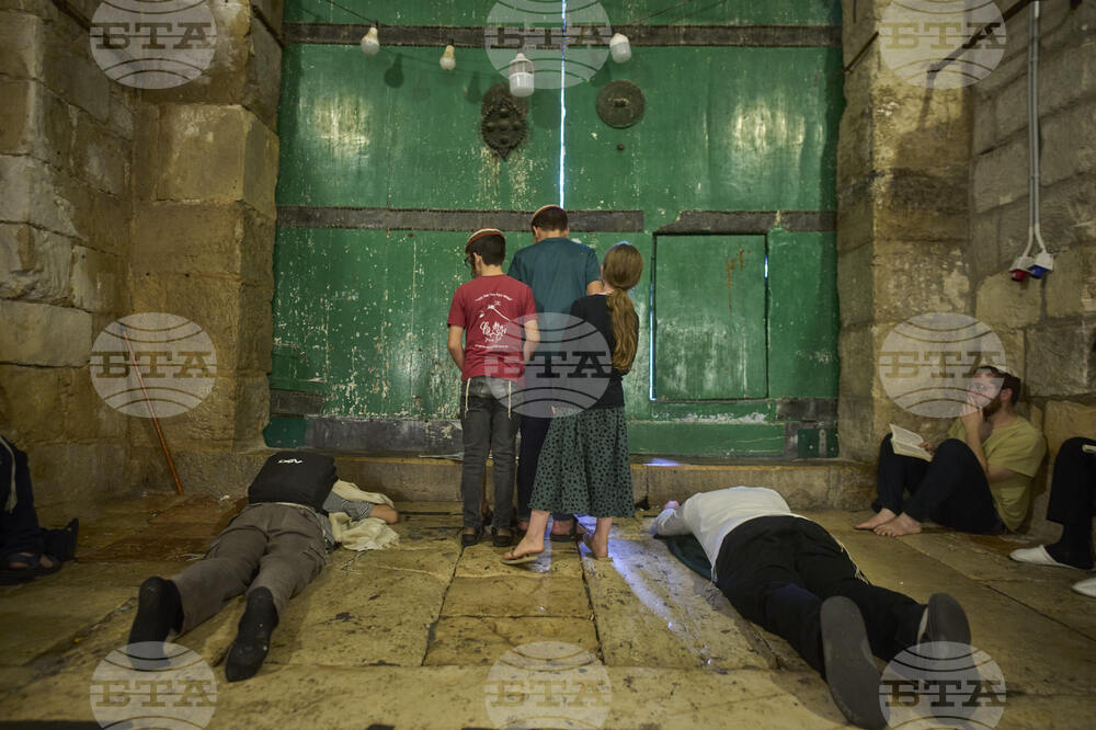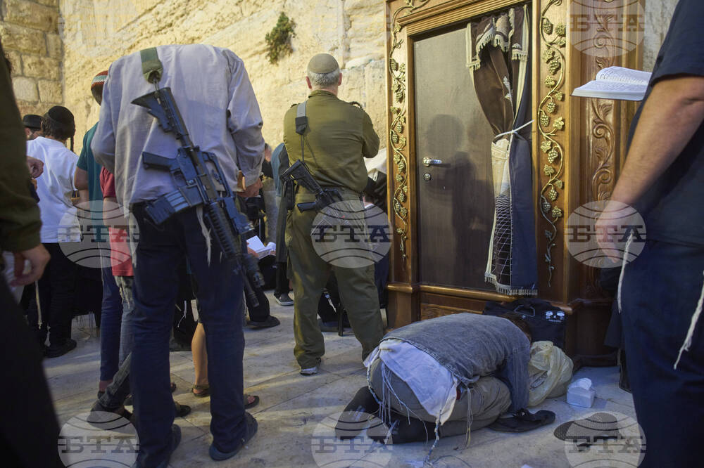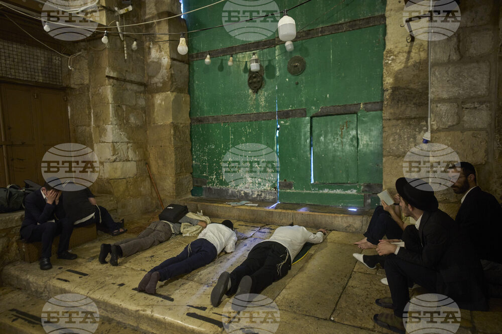 Ultra-Orthodox Jewish men pray during mourning ritual of Tisha B'Av (Ninth of Av) fasting and a memorial day, commemorating the destruction of ancient Jerusalem temples, next to one of the gates to the Temple Mount, known to Muslims as the Noble Sanctuary, or the Al-Aqsa Mosque compound in the Old City of Jerusalem, Sunday, Aug. 3, 2025. (AP Photo/Ohad Zwigenberg)