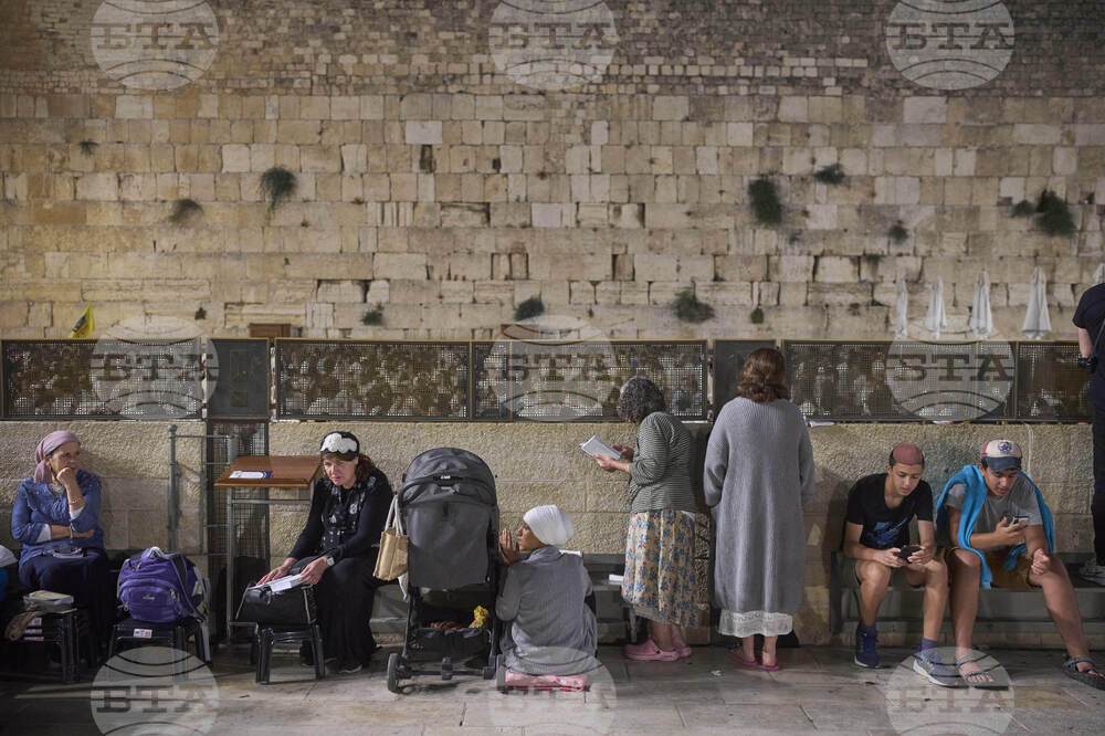 Ultra-Orthodox Jewish woman pray during mourning ritual of Tisha B'Av fasting and a memorial day, commemorating the destruction of ancient Jerusalem temples, at the Western Wall, the holiest site where Jews can pray in the Old City of Jerusalem, Sunday, Aug. 3, 2025 . (AP Photo/Ohad Zwigenberg)