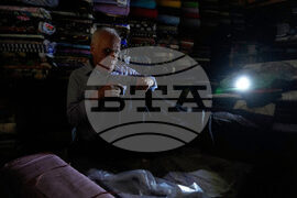A textile seller works at his shop during power outage in Tehran, Iran, Tuesday, Aug. 5, 2025. (AP Photo/Vahid Salemi)