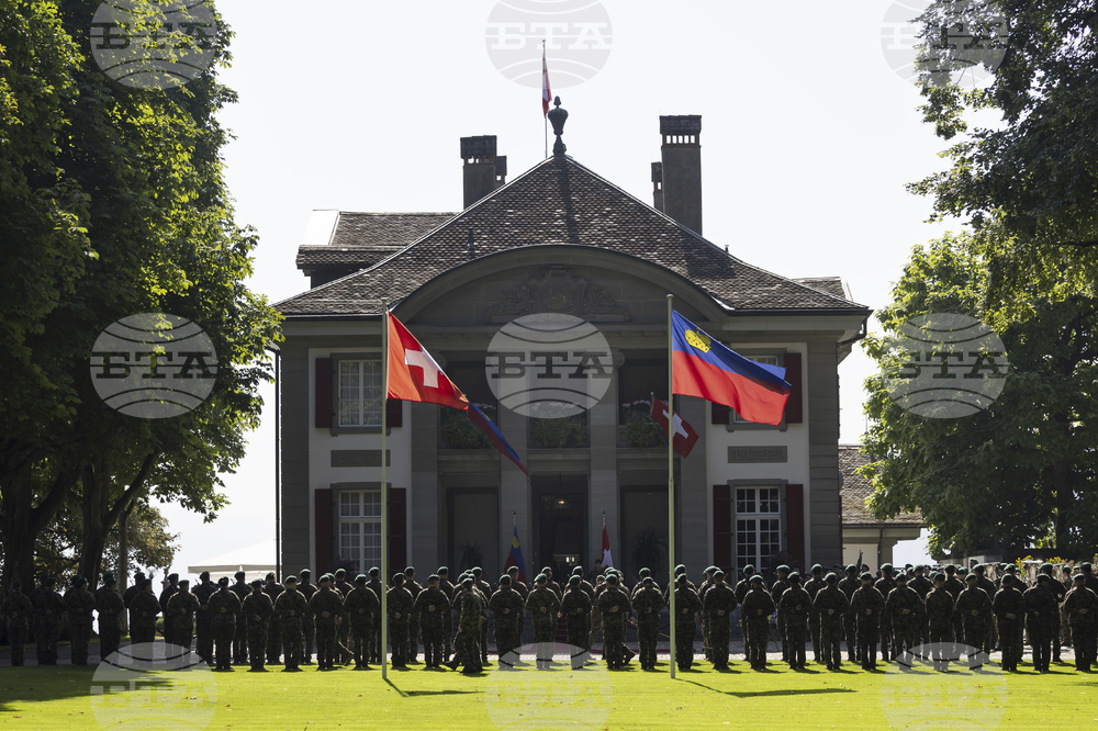 The flags of Switzerland, left, and Liechtenstein wave during an official visit of Liechtenstein's Prime Minister Brigitte Haas in Kehrsatz, near Bern, Switzerland, Monday, August 11, 2025. (Peter Klaunzer/Keystone via AP)