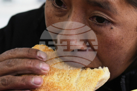 A man eats "pan de batalla," or battle bread, made with government subsidized flour, at a restaurant in La Paz, Bolivia, Saturday, Aug. 9, 2025. (AP Photo/Juan Karita)