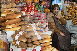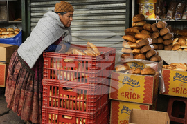 A vendor of non-subsidized bread waits for customers on the sidewalk in La Paz, Bolivia, Saturday, Aug. 9, 2025. (AP Photo/Juan Karita)