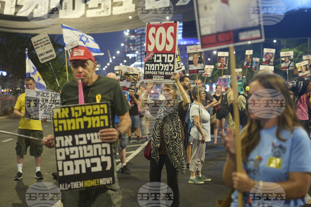 People take part in a protest demanding the end of the war and immediate release of hostages held by Hamas in the Gaza Strip, in Tel Aviv, Israel, Tuesday, Aug. 12, 2025. (AP Photo/Ariel Schalit)
