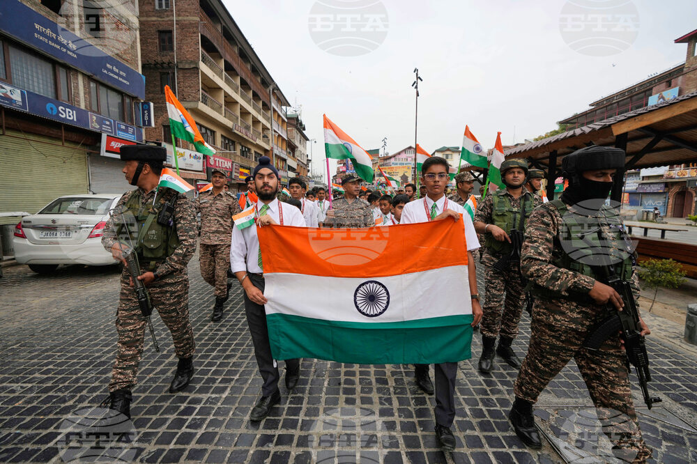Indian paramilitary soldiers guard as students march holding the Indian flag as part of a campaign encouraging every household to hoist the national flag ahead of the Indian independence anniversary in Srinagar, Indian controlled Kashmir, Tuesday, Aug.12, 2025. (AP Photo/Mukhtar Khan)