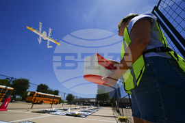 Masslie Arias, of DoorDash, prepares to load a delivery package on a hovering drone Thursday, July 31, 2025, in Frisco, Texas. (AP Photo/Julio Cortez)