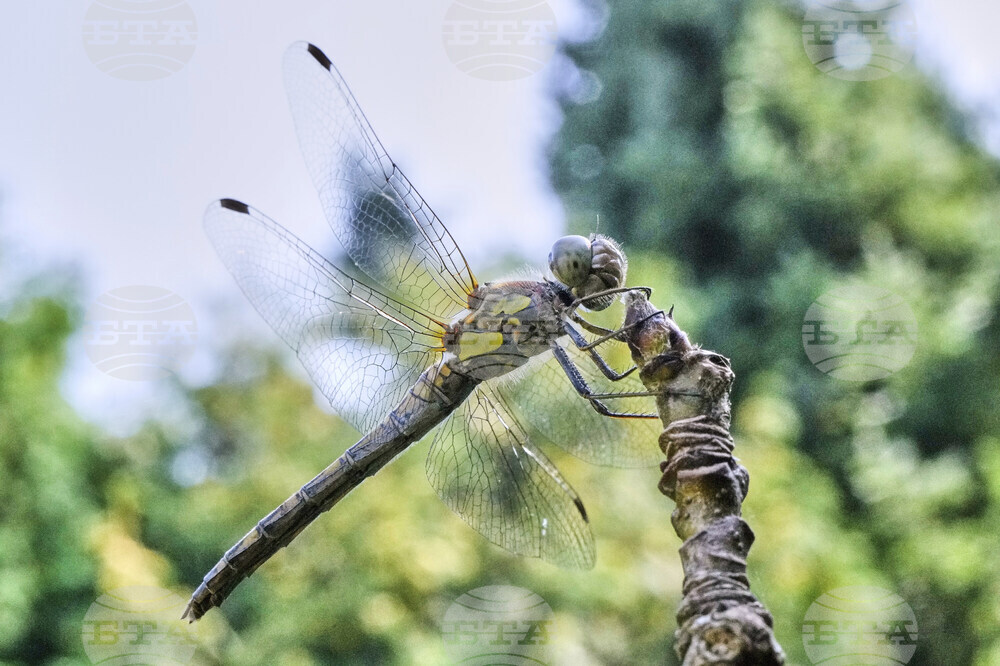 A dragonfly takes a rest on a bud of an apple tree during a hot summer day in a garden in Gelsenkirchen, Germany, Wednesday, Aug. 13, 2025. (AP Photo/Martin Meissner)