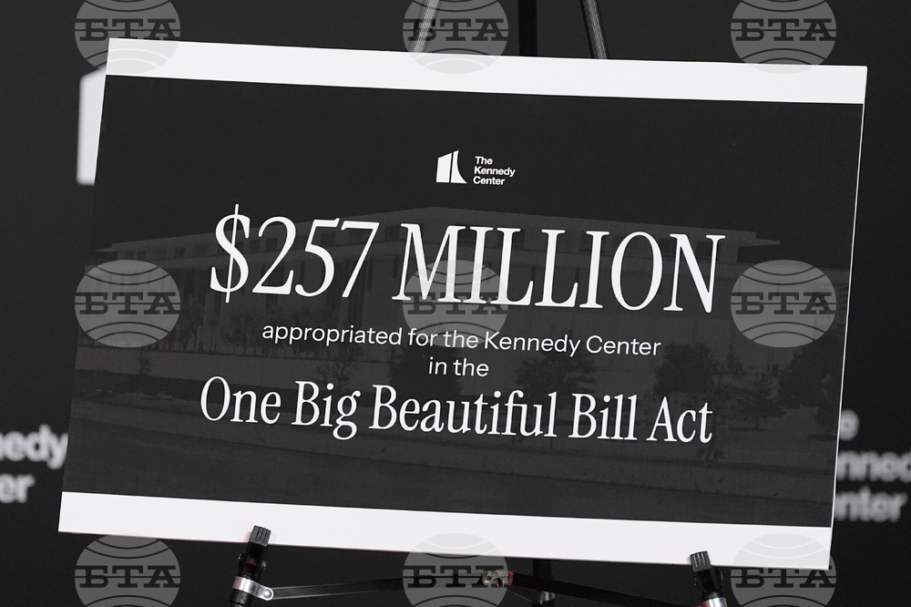 A sign is seen as President Donald Trump speaks at the Kennedy Center, Wednesday, Aug. 13, 2025, in Washington. (AP Photo/Alex Brandon)