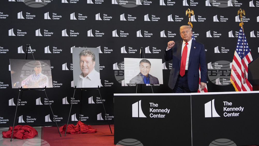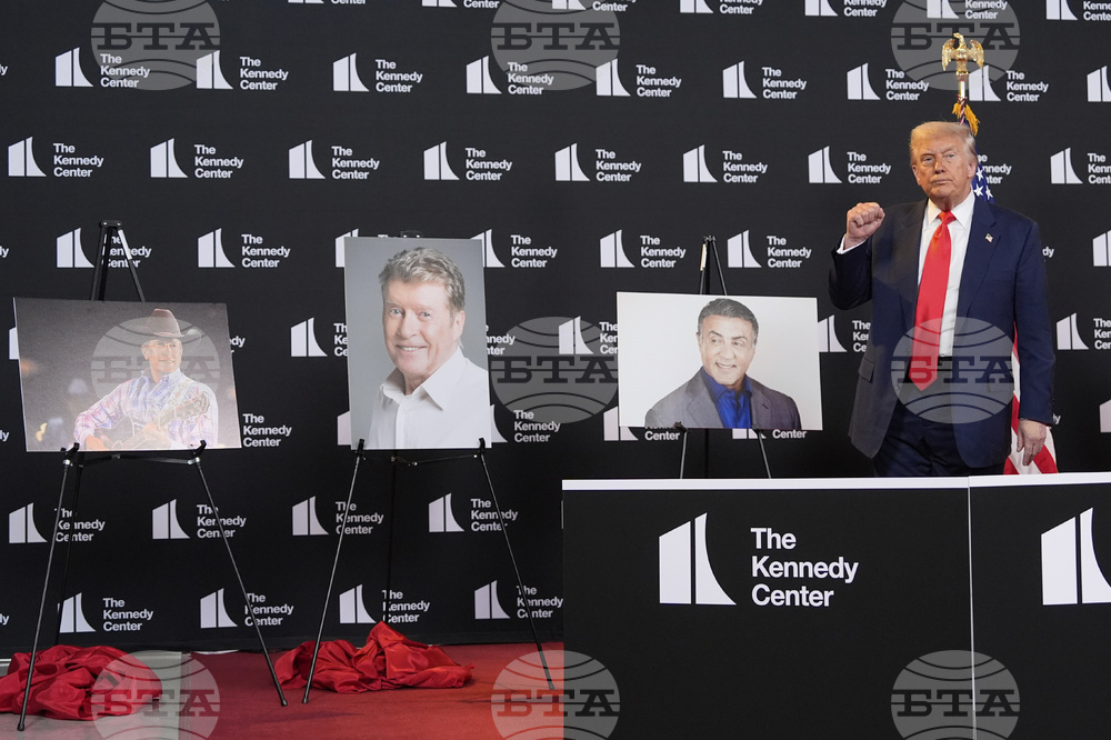 President Donald Trump stands beside photos of Kennedy Center Honors nominees from left showing, country music star George Strait, actor-singer Michael Crawford and "Rocky" actor Sylvester Stallone. The remaining recipients are singer Gloria Gaynor and the rock band Kiss, at the Kennedy Center, Wednesday, Aug. 13, 2025, in Washington. (AP Photo/Alex Brandon)