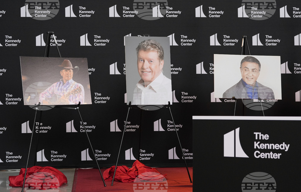 Photos from left showing Kennedy Center Honors nominees, country music star George Strait, actor-singer Michael Crawford and "Rocky" actor Sylvester Stallone. The remaining recipients are singer Gloria Gaynor and the rock band Kiss, at the Kennedy Center, Wednesday, Aug. 13, 2025, in Washington. (AP Photo/Alex Brandon),