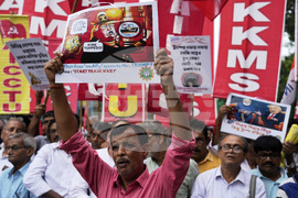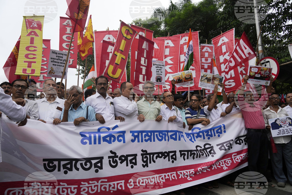 Activists of different trade unions and farmer¥s organizations walk towards the American Consulate in a protest rally against the U.S. President Donald Trump on trade tariffs and the war in Gaza in Kolkata, India, Wednesday, Aug. 13, 2025. (AP Photo/Bikas Das)
