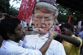 Activists of different trade unions and farmer's organizations shout slogans holding placards and a mask of the U.S. President Donald Trump as they march towards the American Consulate during a protest rally on trade tariffs and the war in Gaza in Kolkata, India, Wednesday, Aug. 13, 2025. (AP Photo/Bikas Das)