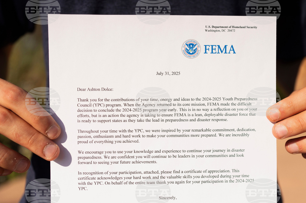 Ashton Dolce holds a letter from FEMA explaining the early termination of the Youth Preparedness Council at Cholla Park on Saturday, Aug. 9, 2025, in Scottsdale, Ariz. (AP Photo/Rebecca Noble)
