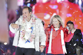 Presidential candidate Jorge "Tuto" Quiroga and his wife Milena Dobronic wave during his closing campaign rally in La Paz, Bolivia, Wednesday, Aug. 13, 2025. (AP Photo/Natacha Pisarenko)