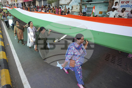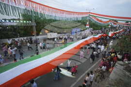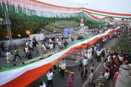 People carry a huge tricolor as they participates in Tiranga Yatra or tricolor march ahead of Independence Day in Ahmedabad, India, Wednesday, Aug. 13, 2025. (AP Photo/Ajit Solanki)