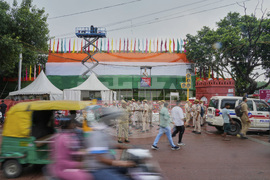 Commuters drive past as Delhi policemen make last minute arrangements for security on the eve of the India's Independence Day celebrations, in the front of the Red Fort, the main venue from where Indian prime minister Narendra Modi will address the nation, in New Delhi, India, Thursday, Aug. 14, 2025. (AP Photo/Manish Swarup)