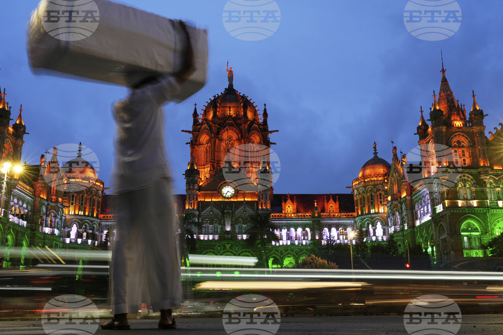 A porter stands in front of Chhatrapati Shivaji Maharaj Terminus illuminated in the Indian tricolours on the eve of the Independence Day celebrations in Mumbai, India, Thursday, Aug. 14, 2025. (AP Photo/Rajanish Kakade)