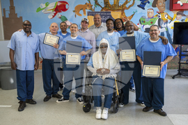 This April 2024 photo provided by UnCommon Law shows a class from the UnCommon Law program Home After Harm celebrate graduation from the 10-month group program, at Salinas Valley State Prison in Soledad, Calif. (UnCommon Law/Justin Bench via AP)