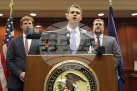 FILE - U.S. Attorney Thomas Cullen, center, speaks with the media in Charlottesville Federal Court in Charlottesville, Va, March 27, 2019. (Andrew Shurtleff/The Daily Progress via AP, File)
