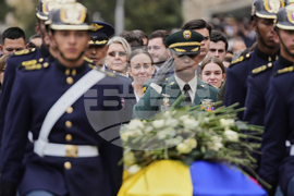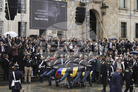 The coffin of presidential hopeful and opposition Sen. Miguel Uribe, who died of gunshot wounds sustained at a political rally, is carried after the funeral service at the cathedral in Bogota, Colombia, Wednesday, Aug. 13, 2025. (AP Photo/Ivan Valencia)