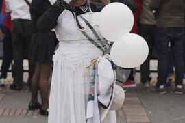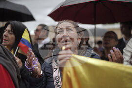 A woman stands outside the cathedral in Bogota, Colombia, ahead of the funeral mass for presidential hopeful and opposition Sen. Miguel Uribe, who died of gunshot wounds sustained at a political rally, Wednesday, Aug. 13, 2025. (AP Photo/Ivan Valencia)