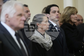 Lina Moreno, wife of former President Alvaro Uribe, and her son Tomas Uribe attend the funeral service for presidential hopeful and opposition Sen. Miguel Uribe, who died from wounds suffered when he was shot at a political rally, at the cathedral in Bogota, Colombia, Wednesday, Aug. 13, 2025. (AP Photo/Fernando Vergara)