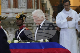 Colombia's former presidents, Cesar Gaviria, left, Ernesto Samper, and Juan Manuel Santos, right, attend the funeral mass for presidential hopeful and opposition Sen. Miguel Uribe, who died of gunshot wounds sustained at a political rally, in Bogota, Colombia, Wednesday, Aug. 13, 2025. (AP Photo/Fernando Vergara)