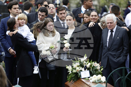 Miguel Uribe, right, and Maria Clara Tarazona, holding her son Alejandro, the father and wife of presidential hopeful and opposition Sen. Miguel Uribe, who died from wounds suffered when he was shot at a political rally, stand with other relatives around his coffin at the cemetery during his funeral in Bogota, Colombia, Wednesday, Aug. 13, 2025. (AP Photo/John Vizcaino)
