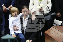 Miguel Uribe, left, and Maria Clara Tarazona, holding her son Alejandro, the father and wife of presidential hopeful and opposition Sen. Miguel Uribe, walk behind his coffin with other relatives after the funeral service in Bogota, Colombia, Wednesday, Aug. 13, 2025. (AP Photo/Ivan Valencia)