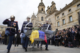 The coffin of presidential hopeful and opposition Sen. Miguel Uribe, who died of gunshot wounds sustained at a political rally, is carried to the cathedral in Bogota, Colombia, Wednesday, Aug. 13, 2025. (AP Photo/Ivan Valencia)