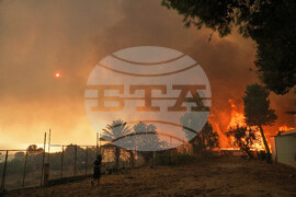 A male youth walks nearby as the fire approaches a house during a wildfire in Patras city, western Greece, Wednesday, Aug. 13, 2025. (AP Photo/Thanassis Stavrakis)