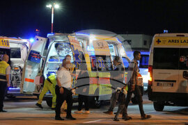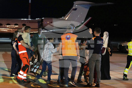 Palestinian children and their families evacuated from Gaza arrive at Rome's Ciampino military airport, Thursday, Aug. 14, 2025. (AP Photo/Gregorio Borgia)