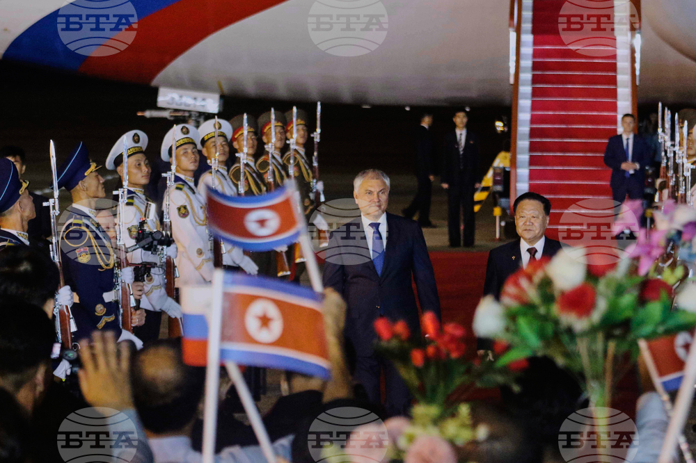In this photo released by The State Duma, Lower House of the Russian Parliament Press Service, Russian State Duma Chairman Vyacheslav Volodin, center left, walks from the plane upon his arrival at the Pyongyang International Airport in Pyongyang, North Korea, Thursday, Aug. 14, 2025. (The State Duma, Lower House of the Russian Parliament Press Service via AP)
