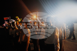North Korean people welcome Russian State Duma Chairman Vyacheslav Volodin upon arrival at the Pyongyang International Airport in Pyongyang, North Korea, Thursday, Aug. 14, 2025, on the occasion of the 80th anniversary of North Korea's liberation. (AP Photo/Jon Chol Jin)