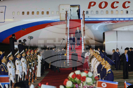 Russian State Duma Chairman Vyacheslav Volodin, center on the landing steps, walks down upon arrival at the Pyongyang International Airport in Pyongyang, North Korea, Thursday, Aug. 14, 2025, on the occasion of the 80th anniversary of North Korea's liberation. (AP Photo/Jon Chol Jin)