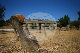 CORRECTS DATE - Shade from pine trees covers some of the graves of Turkish Cypriots at the Muslim cemetery in the village of Tochni, Cyprus on July 3, 2025. (AP Photo/Petros Karadjias)