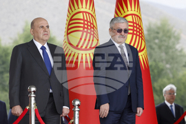 Russian Prime Minister Mikhail Mishustin, left, and Kyrgyz Prime Minister Adylbek Kasymaliev attend a welcoming ceremony at the Rukh Ordo cultural complex in Cholpon-Ata, Kyrgyzstan, Thursday, Aug. 14, 2025. (Dmitry Astakhov, Sputnik, Government Pool Photo via AP)