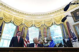 President Donald Trump, from right, and Social Security Commissioner Frank Bisignano listen as a reporter asks a question during an event in the Oval Office to mark the 90th anniversary of the Social Security Act, Thursday, Aug. 14, 2025, in Washington. (AP Photo/Alex Brandon)