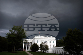 Dark clouds are seen in the sky behind the White House, Thursday, Aug. 14, 2025, in Washington. (AP Photo/Mark Schiefelbein)