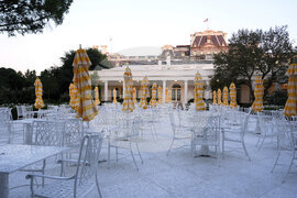 Tables and chairs stand in the newly renovated Rose Garden of the White House, Friday, Aug. 15, 2025, in Washington. (AP Photo/Julia Demaree Nikhinson)