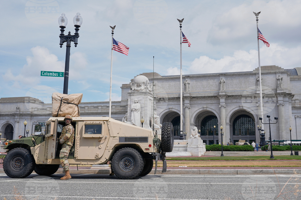 District of Columbia National Guard soldiers keep watch as travelers arrive at the entrance to Union Station near the Capitol, Thursday, Aug 14, 2025, in Washington. (AP Photo/Mariam Zuhaib)