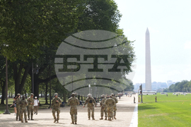 Soldiers from the District of Columbia National Guard patrol along the National Mall Thursday, Aug. 14, 2025, in Washington. The Washington Monument is seen in the distance. (AP Photo/Jacquelyn Martin)