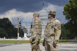 District of Columbia National Guard soldiers patrol on the National Mall, Thursday, August 14, 2025, in Washington. The U.S. Capitol is seen in the distance. (AP Photo/Jacquelyn Martin)