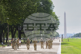 District of Columbia National Guard soldiers patrol on the National Mall, Thursday, August 14, 2025, in Washington. The Washington Monument is seen in the distance. (AP Photo/Jacquelyn Martin)