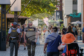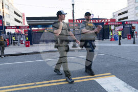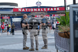 DEA agents patrol outside of the Nationals Park during a baseball game between the Nationals and Philadelphia Phillies in Washington, Thursday, Aug. 14, 2025. (AP Photo/Jose Luis Magana)