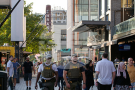 People walk past Washington Metropolitan Police officers on 14th St., in northwest Washington, Thursday, Aug. 14, 2025. (AP Photo/Cliff Owen)