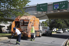 Garbage trucks wait as the homeless empty their belongs from their tents, Thursday, Aug. 14, 2025, in Washington. (AP Photo/Jacquelyn Martin)