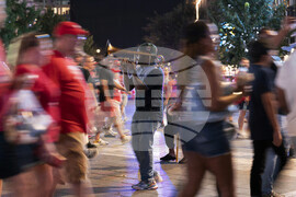 Street musician is seen with a slow shutter speed, as people exist Nationals Park after a baseball game between the Nationals and Philadelphia Phillies in Washington, Thursday, Aug. 14, 2025. (AP Photo/Jose Luis Magana)