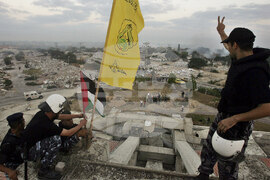 FILE - Palestinian police set up Palestinian and Fatah flags on top of a synagogue in the former Jewish settlement of Neve Dekalim in the southern Gaza Strip Monday Sept. 12, 2005. (AP Photo/Emilio Morenatti, File)