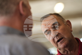 Missouri Representative Jim Kalberloh speaks to an attendee during the Governor's Ham Breakfast at the Missouri State Fair Thursday, Aug. 14, 2025 in Sedalia, Mo. (AP Photo/Charlie Riedel)